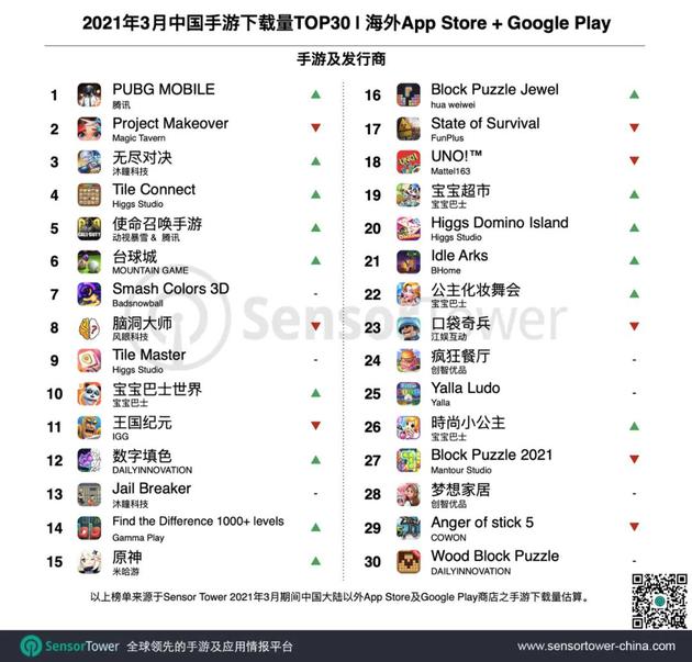 下载量方面,正值3周年庆典的《PUBG MOBILE》以近1100万次下载重回榜首。上市3年来,该游戏在海外App Store和Google Play累计获得超过7.1亿次下载,是海外下载量最高的战术竞技手游。